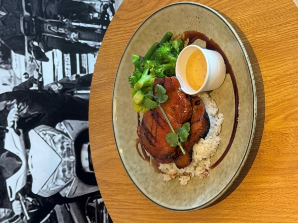 Fresh marinated chicken fillet, grilled and served with garlic rice and steamed vegetable